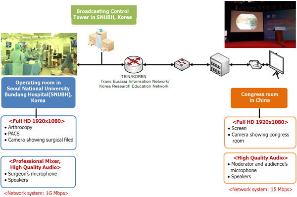 Every Friday is the surgery day of Professor Oh. On the day of live surgery, 8 patients were scheduled from 8:00 AM with a variety of shoulder procedures which included shoulder arthroplasty, arthroscopic rotator cuff repair, and fracture management. The live surgery was supposed to start at 2:30 PM in Korean time (1:30 PM local time in China). Thve Operating team that included the anesthesiologist as well as the operating nurses were well coordinated to facilitate the scheduled procedures with no delays, however there was tremendous stress in the operating team as they had to finish the scheduled surgeries without delay in order to proceed the live surgery on time. At the same time, the technical broadcasting team of SNUBH were preparing for the setting up video/audio equipment and internet transmission for the live surgery.