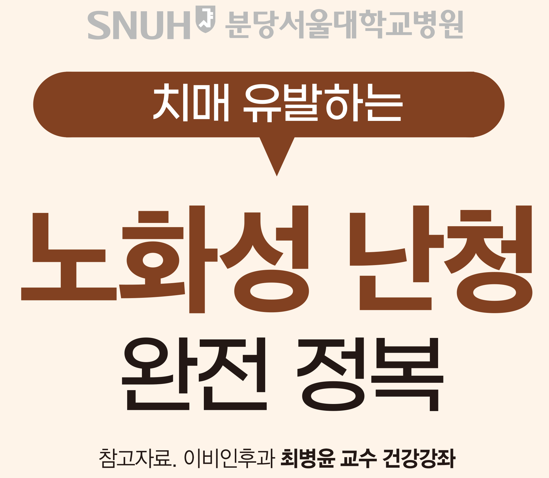 본 내용은 분당서울대학교병원(SNUBH) 건강강좌 ‘치매 유발하는 노화성 난청 완전 정복’(이비인후과과 최병윤 교수) 내용을 바탕으로 정리한 것입니다. SNUBH 유튜브 채널(www.youtube.com/user/snubh)을 방문하시면 다양한 건강정보를 얻을 수 있습니다.