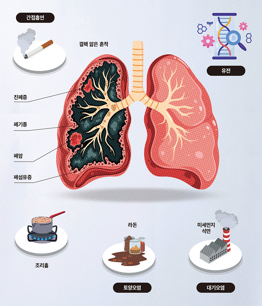 폐암 발생의 약 70%가 흡연과 연관되어 있으며, 흡연자는 비흡연자에 비해 폐암 위험이 10배 이상 증가한다. 그러나 더 이상 흡연 여부만으로 위험을 설명하기 어렵게 된 것도 사실이다. 미세먼지, 조리 과정에서 발생하는 연기, 실내 라돈, 간접흡연까지. 폐의 건강을 위협하는 요인은 우리가 숨 쉬는 일상 전반으로 확대됐다.