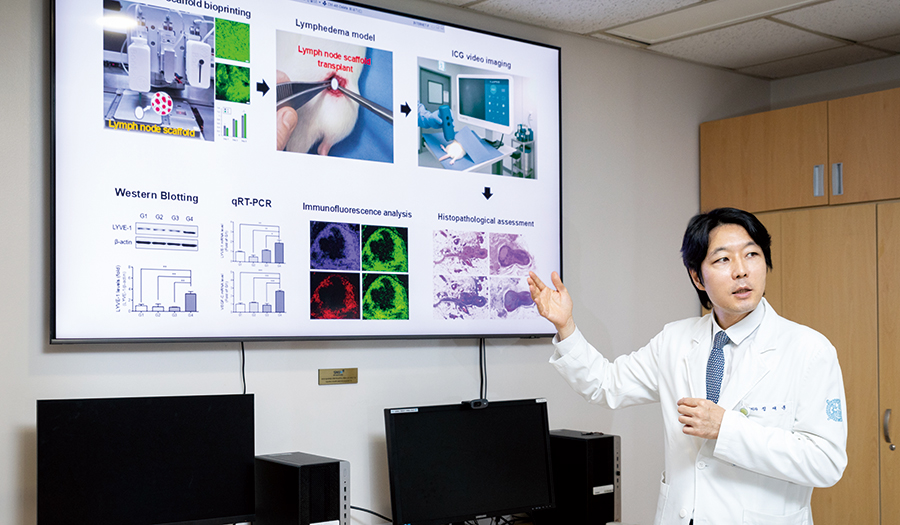 “림프부종은 마치 고속도로 톨게이트에 문제가 발생해 교통체증을 겪고 있는데도 우회도로를 놓거나(림프정맥문합술) 차를 뒤에서 밀어내는 방식(압박)으로 치료가 이루어져 왔습니다. 당연히 지속적인 효과를 기대하기 어려웠죠. 성형외과 전문의로 유방암 환자의 유방재건수술과 미세수술 등을 담당해 온 저는 림프부종 으로 고생하는 환자들을 보며 안타까움을 느꼈고, 치료법과 관련한 연구를 계속해 왔습니다.”
